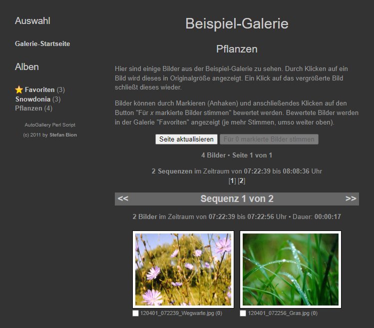 Das CGI-Script "AutoGallery" erstellt anhand der auf dem Webserver vorhandenen Verzeichnisstruktur automatisch eine Bilder-Galerie. Das Script eignet sich vor allem für Bilder gleicher Größe, die von einer Webcam mit Bewegungserkennung automatisch auf den Webserver hochgeladen werden.