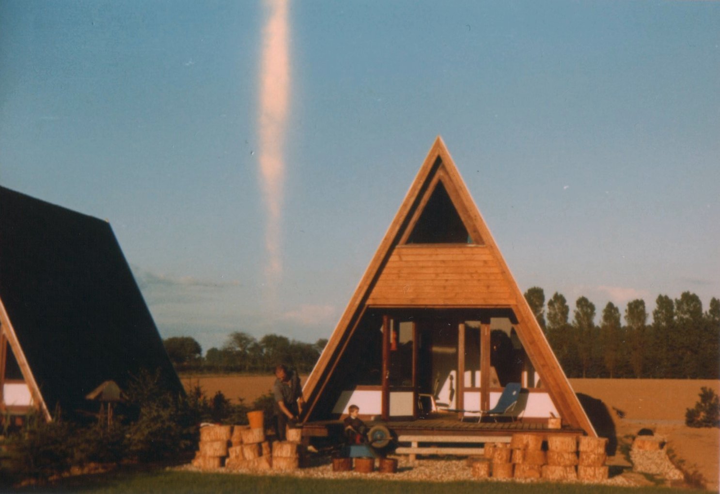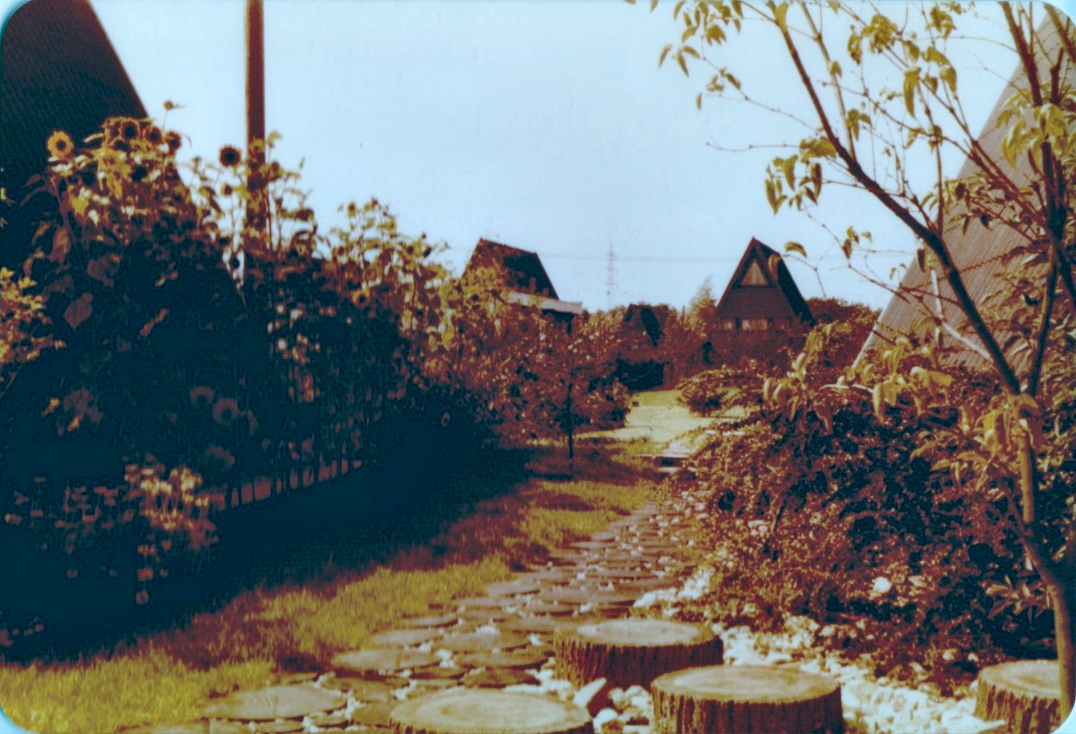 Zwei Nurdach-Häuser; unseres war das linke, erkennbar an den runden Baumscheiben, die als Wegpflasterung dienten (13.11.1973, 6 Jahre).