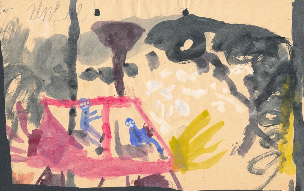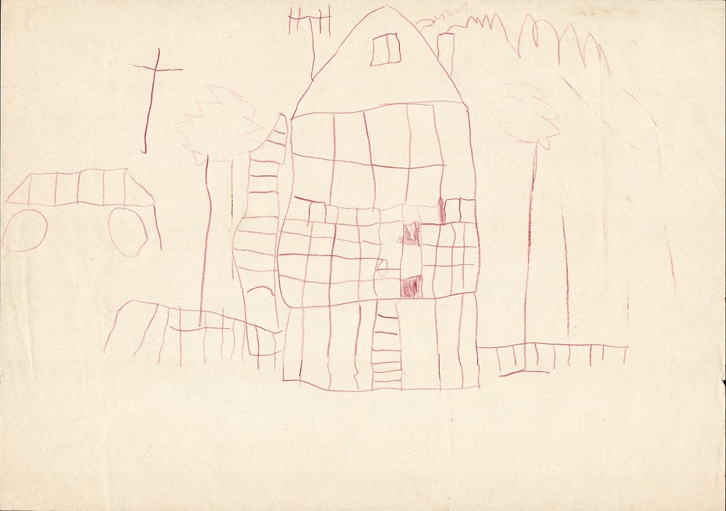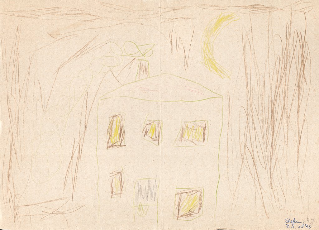 Haus zwischen zwei Bäumen – erstmals mit Wasserfarbe gemalt (Mai 1975, 7½ Jahre)