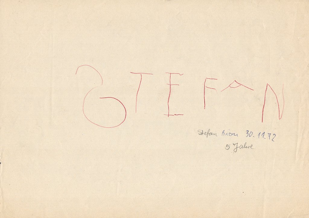Mein Name, eher "gemalt" als geschrieben, auf der Rückseite des Bildes (30.11.1972, 5 Jahre)