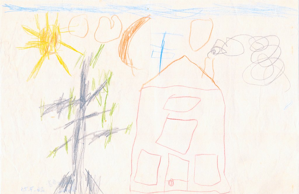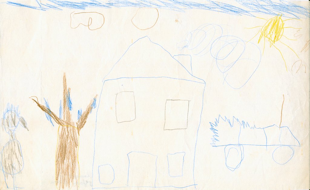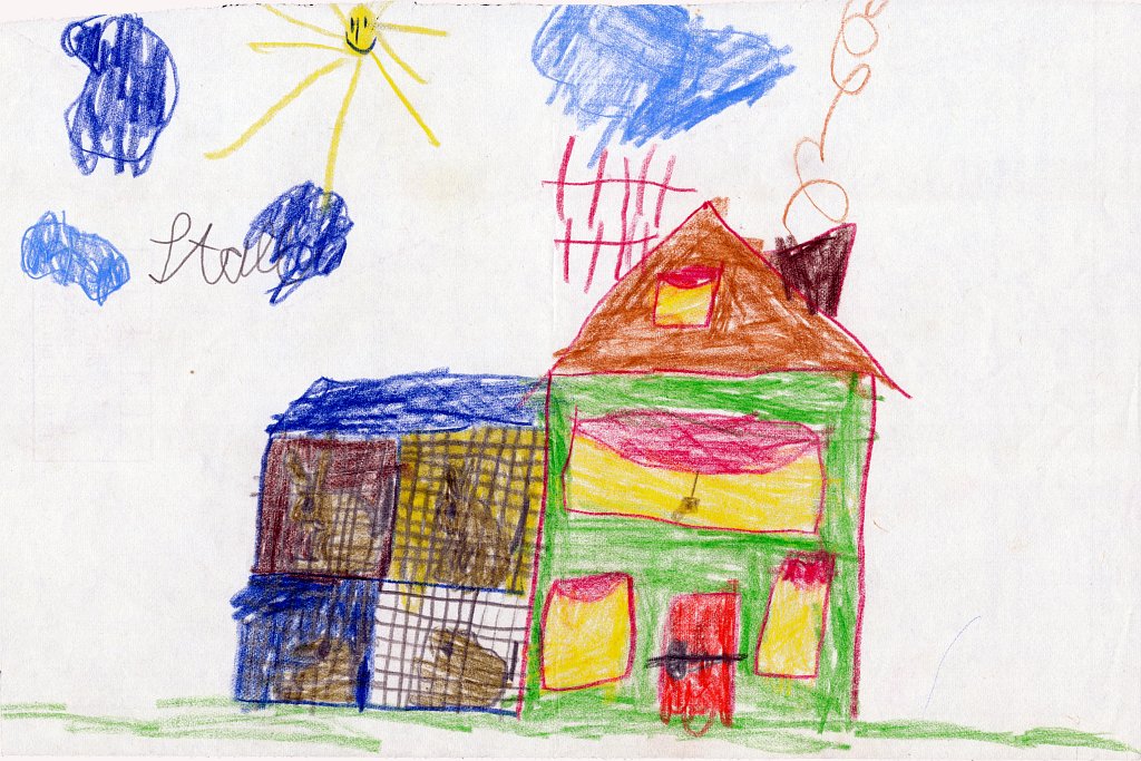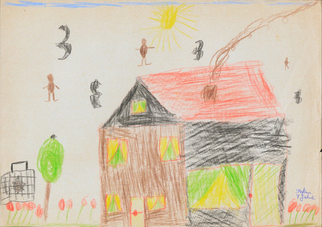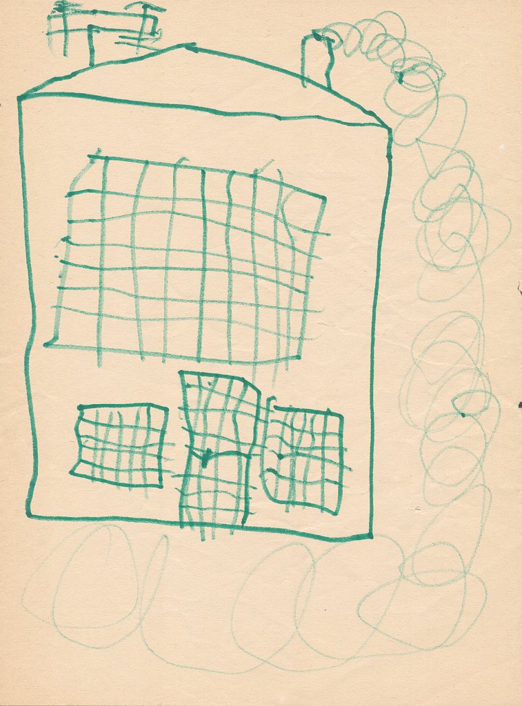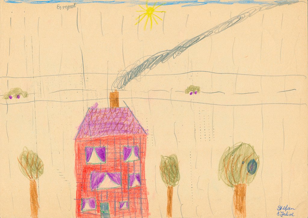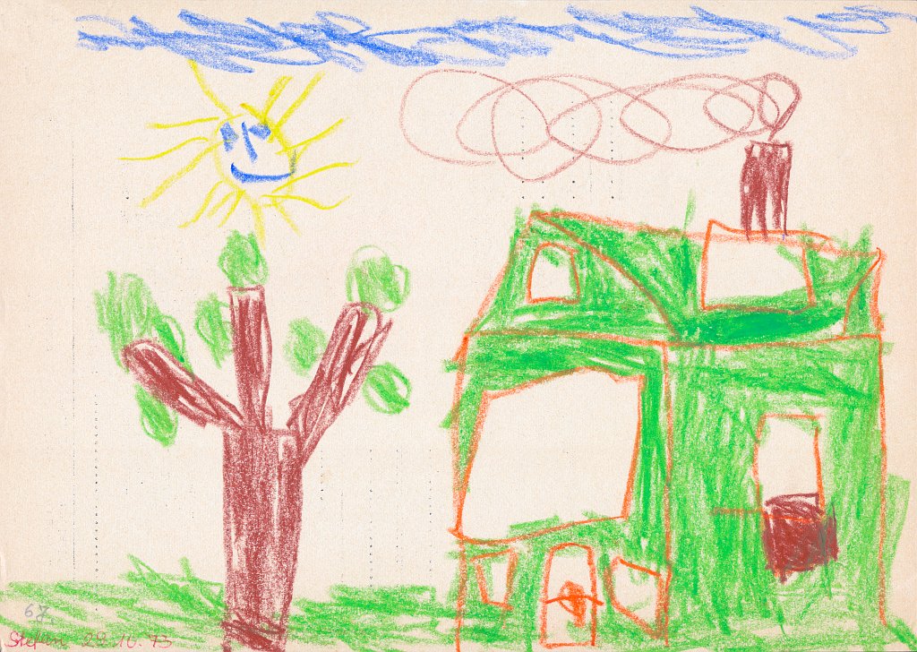 Häuser scheine ich als Kind besonders gerne gemalt zu haben - meist mit rauchendem Schornstein, manchmal mit Fernseh-Antenne auf dem Dach, aber fast immer zwischen zwei Bäumen oder neben einem Baum. Und immer ist der Himmel ein schmales blaues Band am oberen Bildrand, und die ist Sonne gelb mit Strahlen und lachendem Gesicht.🌞