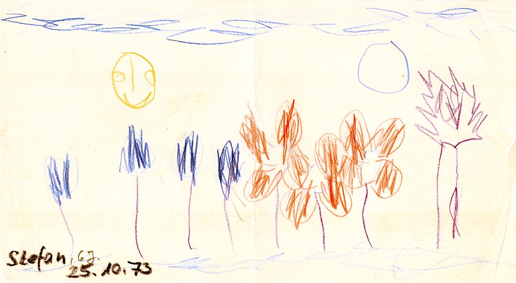 Bäume gehörten definitiv zu meinen Lieblingsmotiven als Kind. Sie sind eigentlich auf fast allen Bildern zu sehen. Auch Tiere und Pflanzen sind auf anderen Bildern enthalten. Hier einige Bilder, auf denen Tiere, Pflanzen oder ein Baum das Hauptmotiv darstellen:
