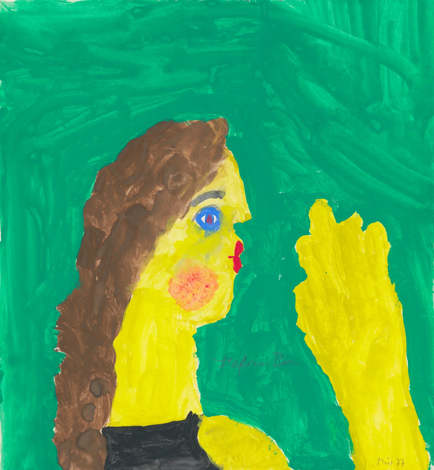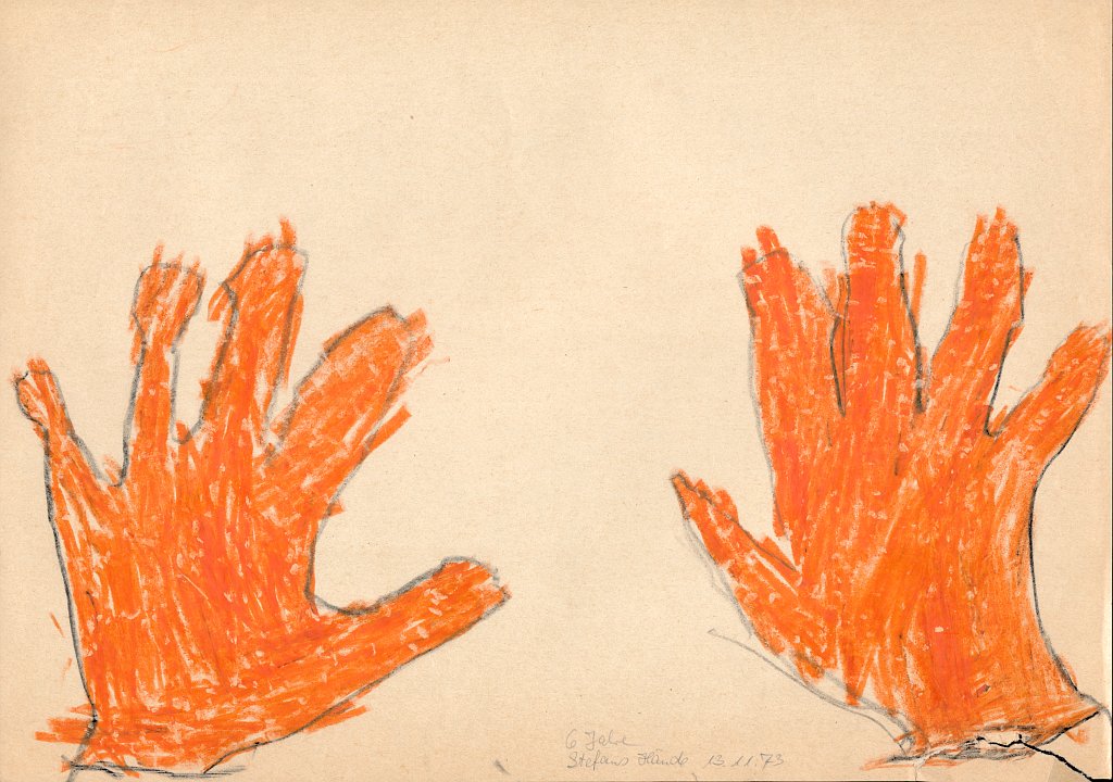 »Stefans Hände« – Die ausgemalten Umrisse meiner Hände, mit denen ich alle diese Bilder gemalt habe (13.11.1973, 6 Jahre)