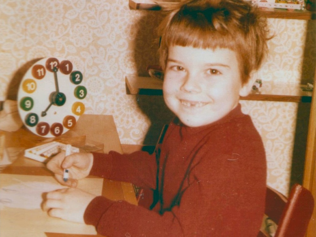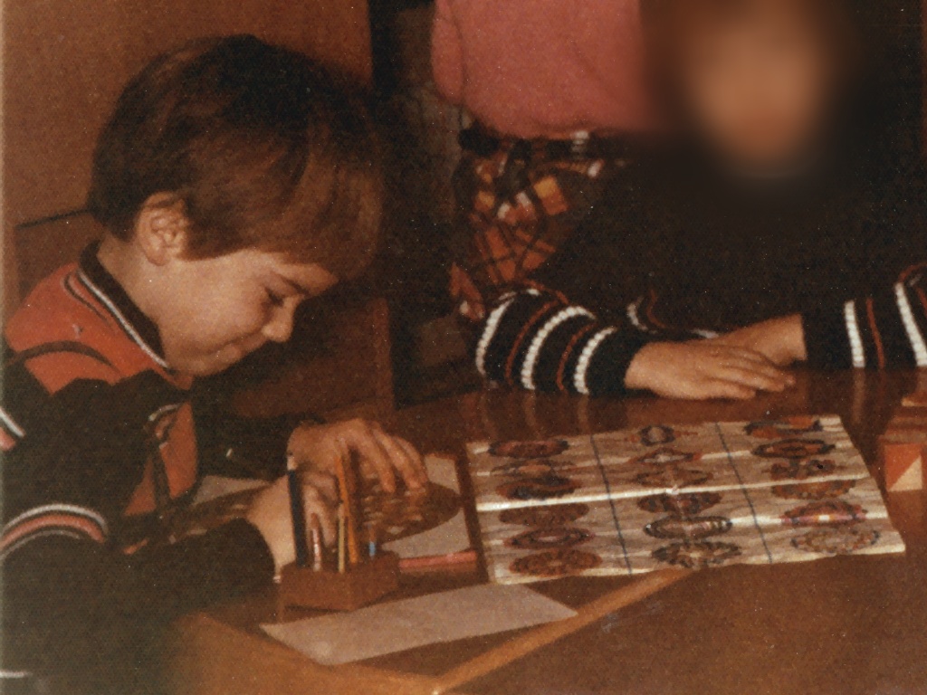 Hier bin ich schon ein Jahr älter (schon im 1. Schuljahr), sitze an meinem Schreibtisch im Kinderzimmer und male anscheinend das Ziffernblatt einer Uhr ab (Dezember 1974, 7 Jahre). – Der rote Klappstuhl, auf dem ich da sitze, ist übrigens nach über 50 Jahren weiterhin in Gebrauch!😃