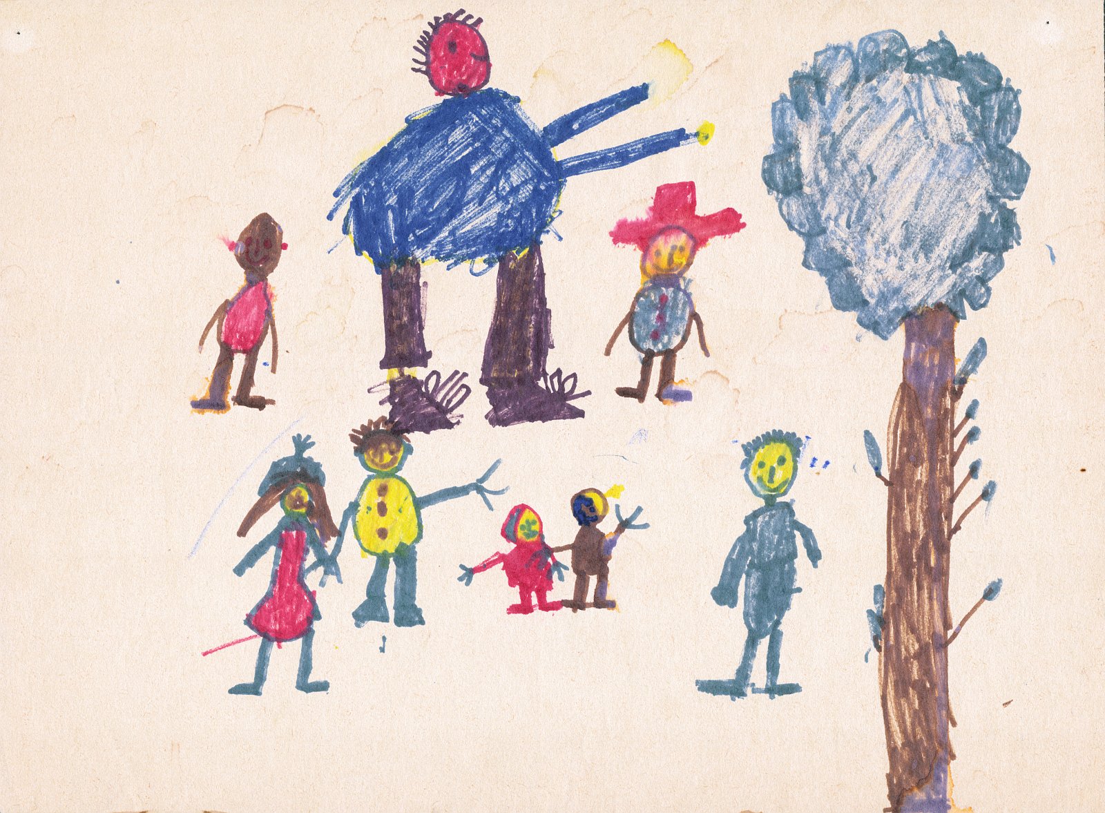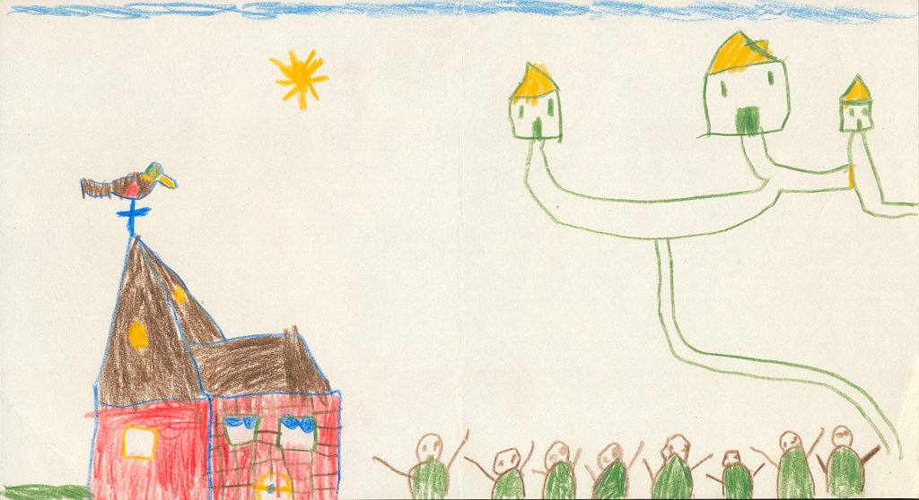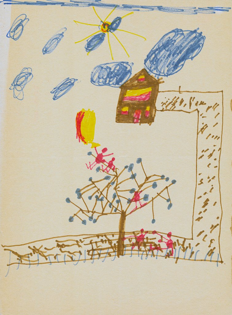 Haus zwischen zwei Bäumen mit fröhlichen Personen und fliegenden Vögeln (1975/1976, 8 Jahre)