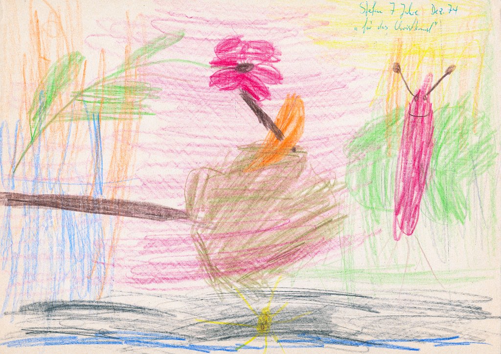 Ein richtiges Vergleichsbild habe ich nicht gefunden, daher hier ein Bild, wie ich im Kindergarten etwas male (Januar 1974, 6 Jahre). – Ob man die Stifte heute auch noch so gefährlich mit den Spitzen nach oben hinstellen würde?