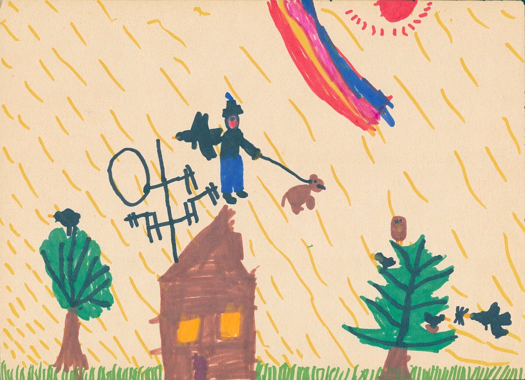 Haus zwischen Bäumen bei Regen (und gleichzeitig Sonne😄); im Hintergrund eine Straße mit Autos (1975/1976, 8 Jahre)