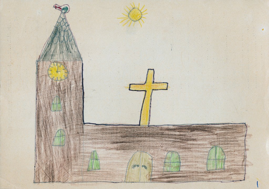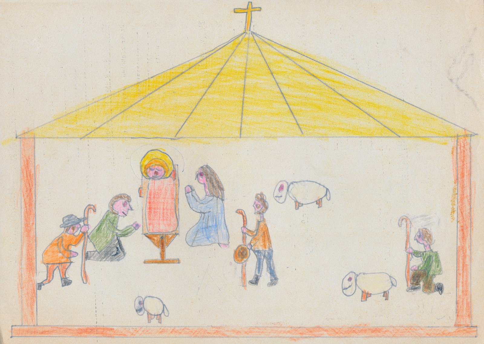Weihnachtskrippe mit Jesuskind, Josef und Maria, drei Hirten und 3 Schafen; auf der Dachspitze ein goldenes Kreuz (Dezember 1975, 8 Jahre). Siehe dazu auch die Weihnachtsgeschichte in der Bibel: Lukas 2,1-20