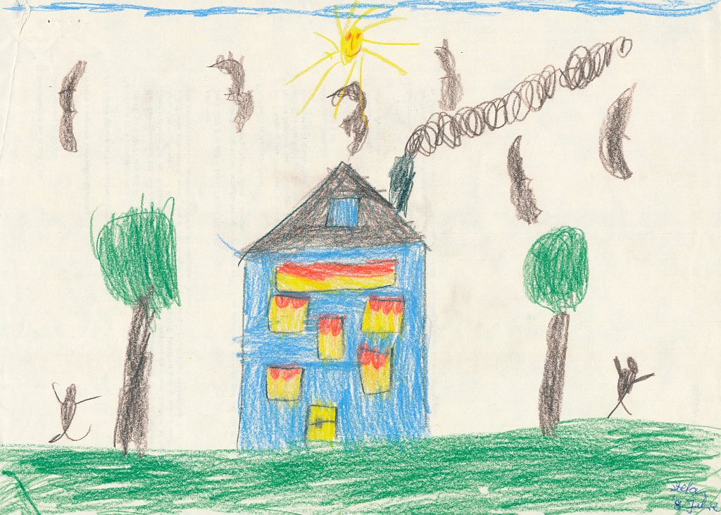 Brennendes Haus mit Feuerwehr (Dezember 1975, 8 Jahre)