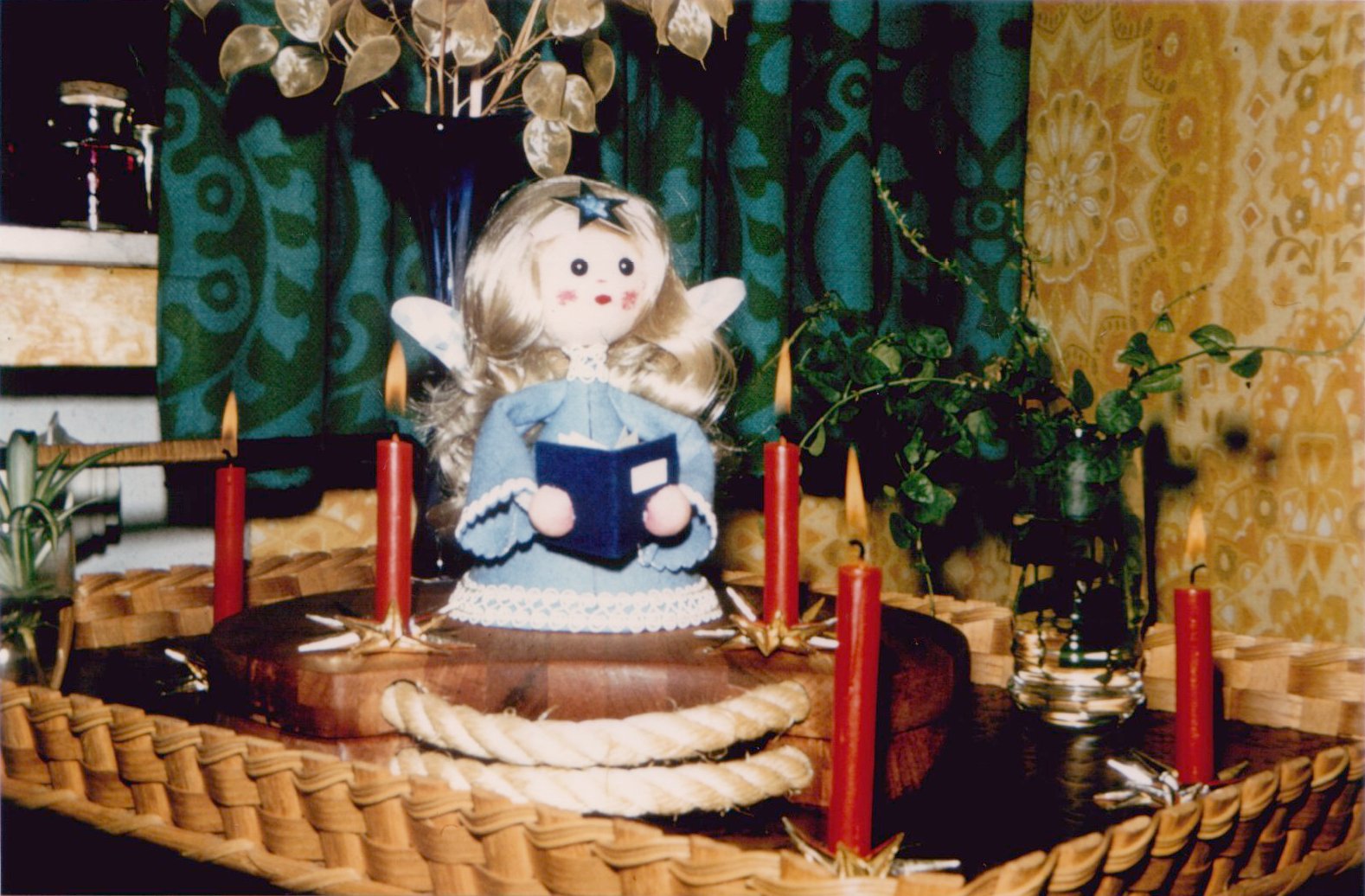 Als "reale Vorlage" für das Bild diente mir dieser von meiner Mutter gebastelte Engel, hier zu sehen auf einem Foto von 1977 mit wiederhergestellter Frisur nach einem gescheiterten Kämmversuch meinerseits😁).