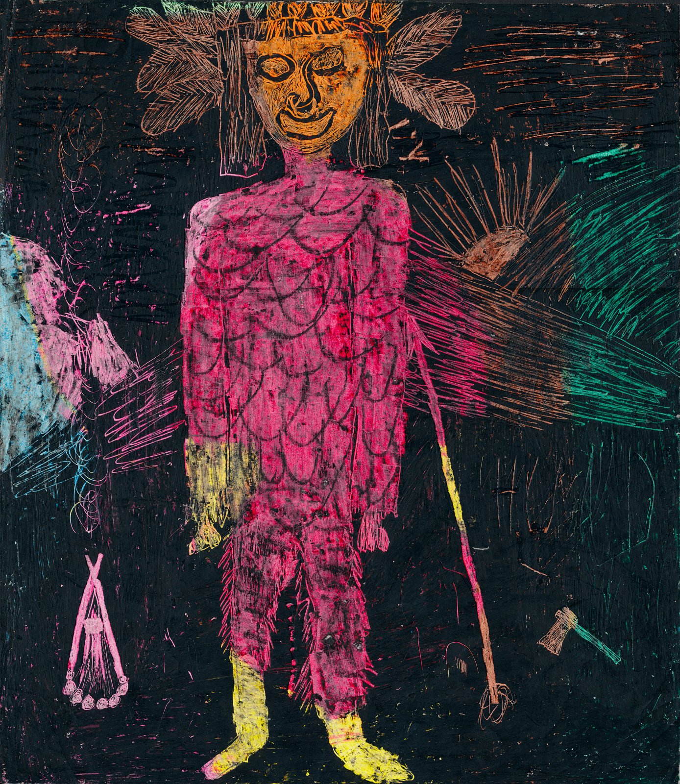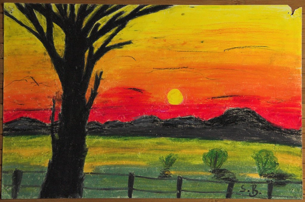 Ein "Indianer" zwischen Lagerfeuer, Speer und Hackebeilchen in einer Berglandschaft mit auf- oder untergehender Sonne (undatiert; vielleicht von 1977). – Solche "Wachs-Kratz-Bilder" haben zwar einen netten Effekt, sind aber auch mühsam herzustellen, weil man zuerst das komplette Blatt vollständig mit zwei Schichten Wachsstift (erst bunt, dann schwarz) übermalen muss, bevor man dann das eigentliche Motiv hineinkratzen kann. Habe ich nie gerne gemacht; war eine Schul-Übung.