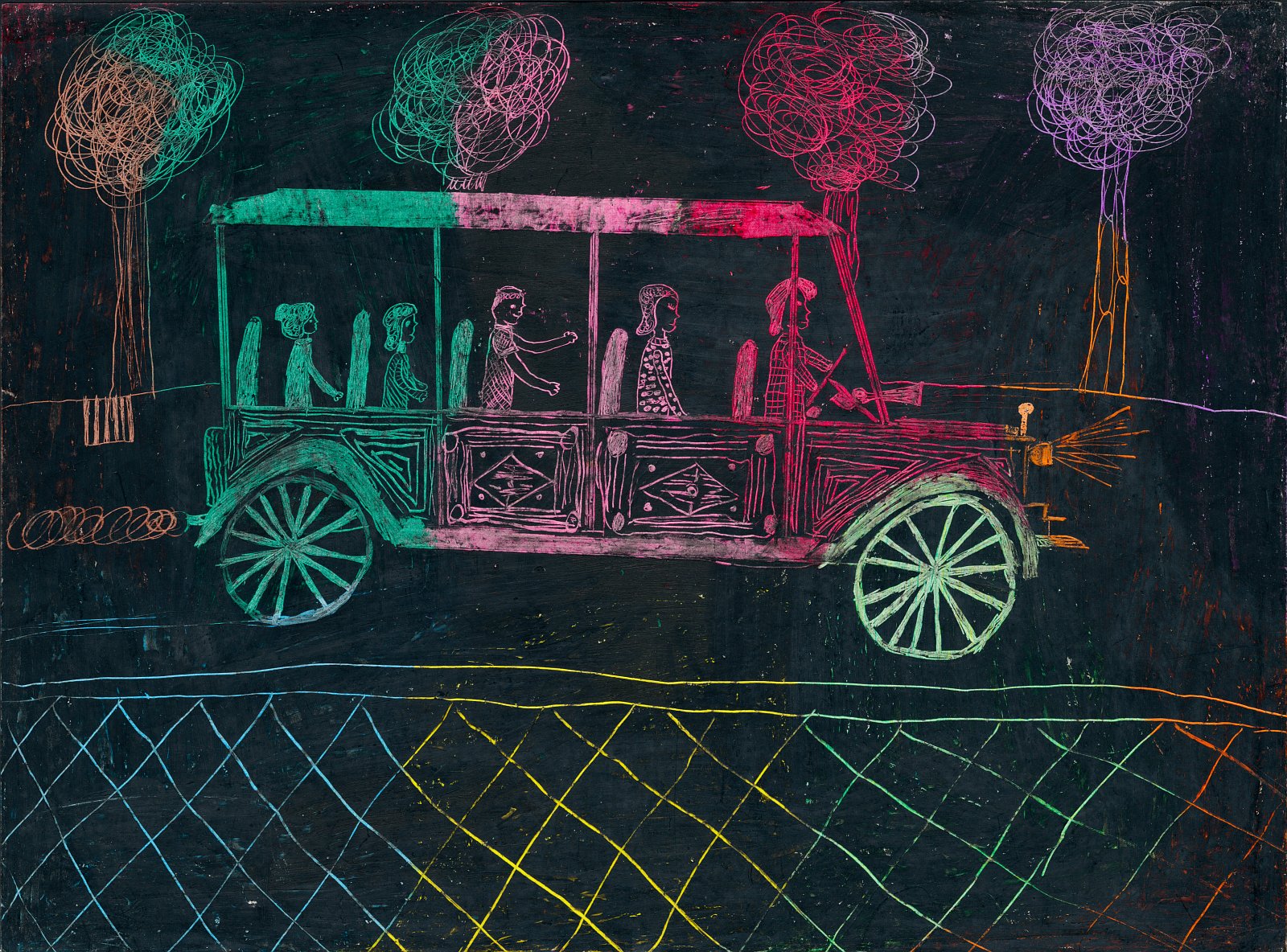 Eine lustige Ausfahrt mit dem Oldtimer-Bus (undatiert; vielleicht von 1977). – Wieder so ein "Wachs-Kratz-Bild"...