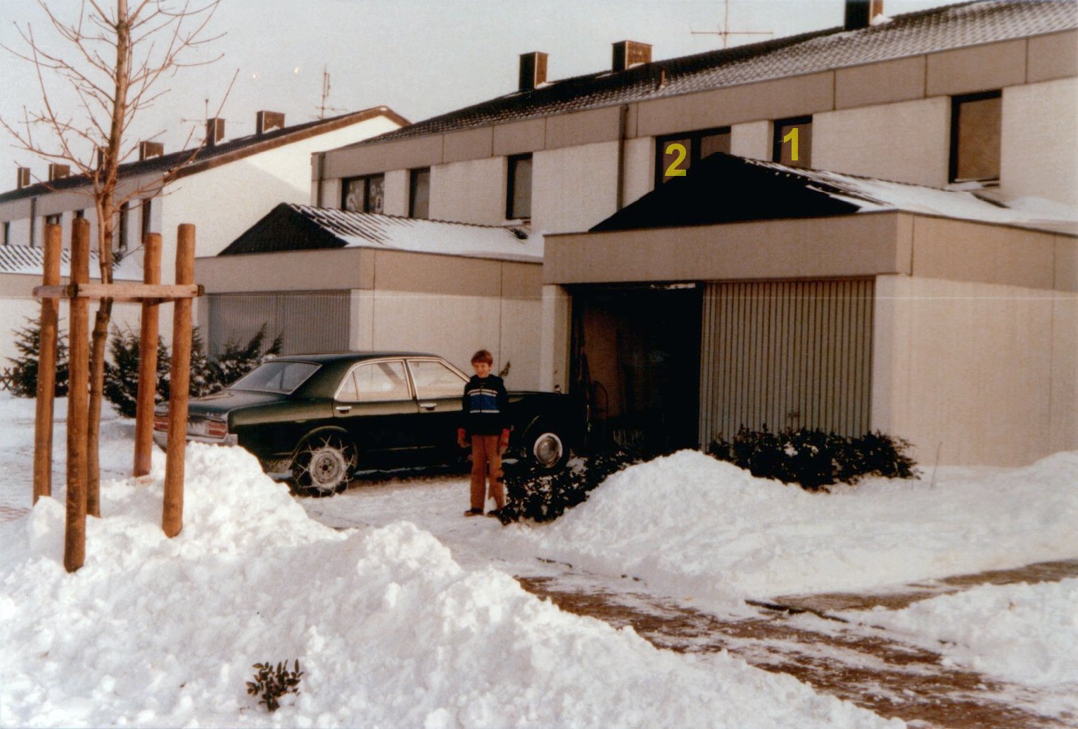 Das Haus in der Außenansicht (Foto vom "Super-Winter" 1978/1979). Zu sehen sind hier die Garagen, von denen unsere in der Zeichnung links unten zu sehen ist. "1" ist das Fenster aus der Zeichnung, "2" das Fenster auf dem Vergleichsbild.