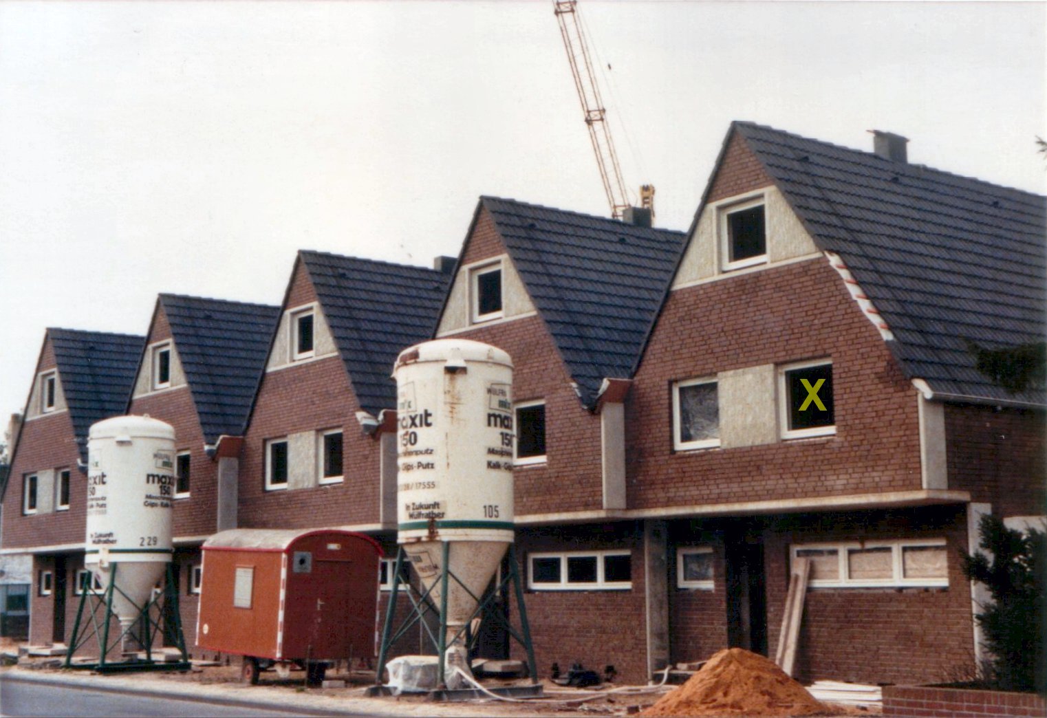 Bereits ein knappes Jahr später war das Haus fast fertig (Foto vom 16.10.1980); im Januar 1981 sind wir eingezogen. Das mit "X" markierte Fenster gehörte zu meinem Zimmer, das auf dem nächsten Bild zu sehen ist.