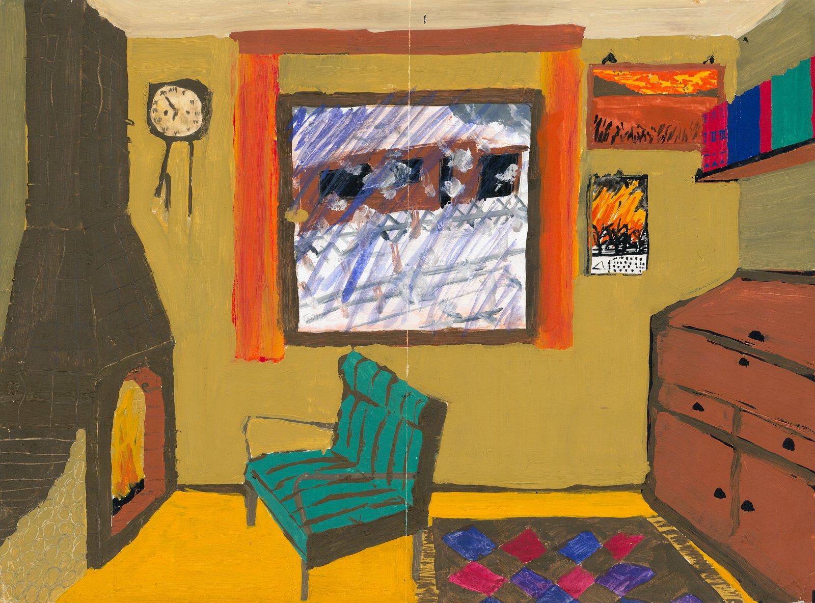 »Drinnen warm, draußen kalt« oder umgekehrt – das sollten wir im Kunstunterricht malerisch darstellen (ich habe mich für Ersteres entschieden) (ca. 1980/1981, 7. Schuljahr). Interessante Details: 1.) Die Uhr muss falsch gehen, denn im Winter bei Schnee ist es weder um 7 Uhr morgens noch abends um 19 Uhr draußen hell. 2.) Die Bücher im Regal an der rechten Wand ähneln auffallend denen in der "Oma"-Zigarrenkiste (siehe hier).