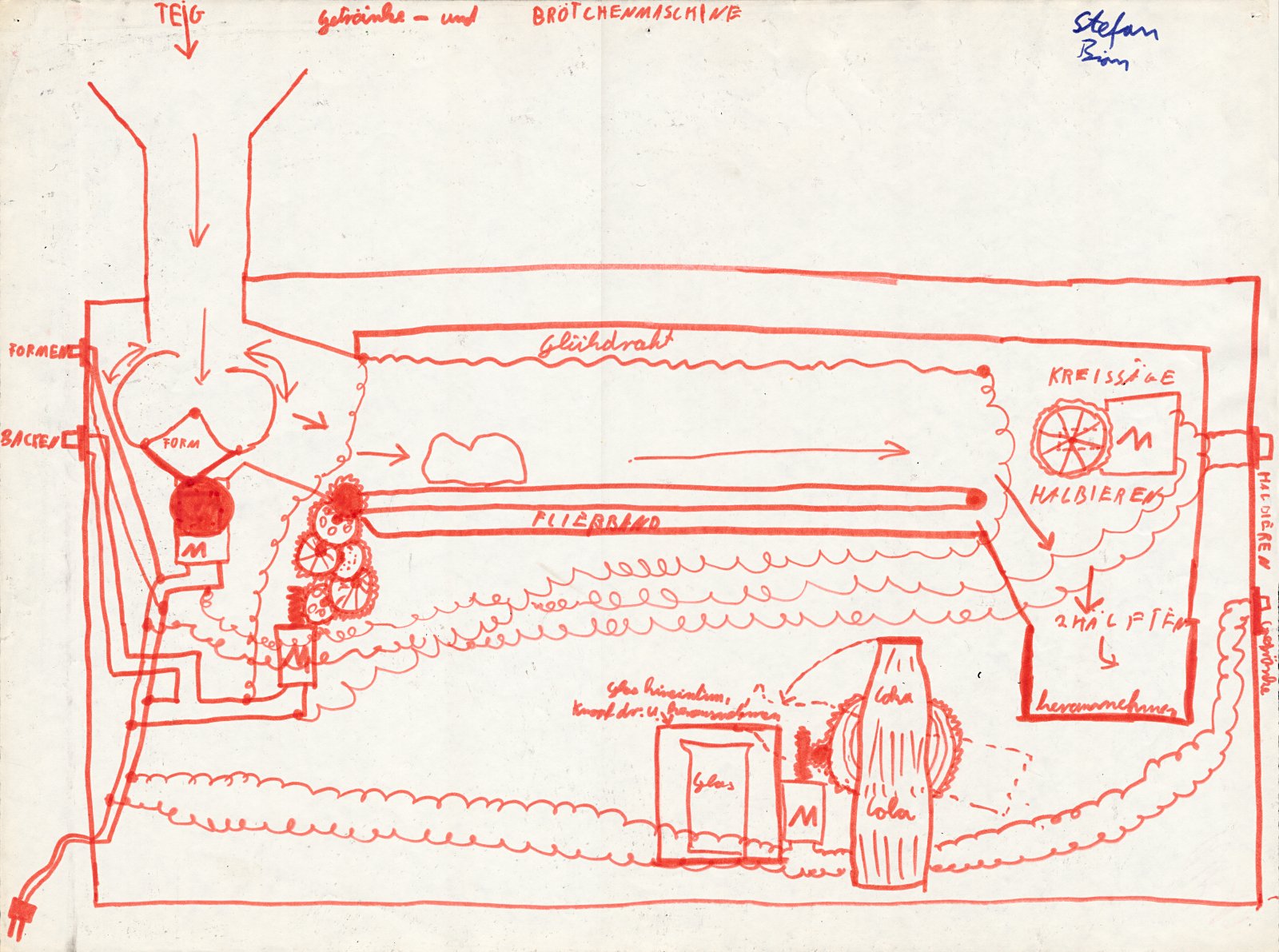 Getränke- und Brötchenmaschine (undatiert, vielleicht 1978). – Man beachte das Zahnradgetriebe mit starker Untersetzung, damit sich das Fließband nur langsam bewegt, um dem Brötchen genügend Zeit zum Backen zu geben.😄