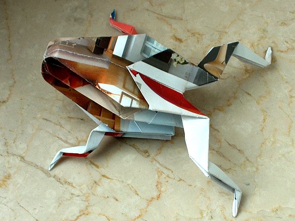 Ein aus einem Immobilien-Werbeprospekt gefalteter Origami-Frosch auf der Fensterbank.