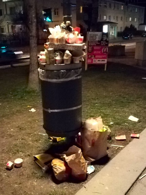 Essen-to-go ist gefragter denn je... Überfüllter Mülleimer in München-Laim (2021).