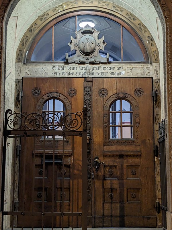 »Stähl' deine Kraft, greif wacker an! Ein rechter Knab', ein rechter Mann!« - Motto über einer Schule in München-Laim (2023)