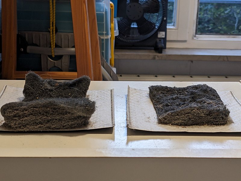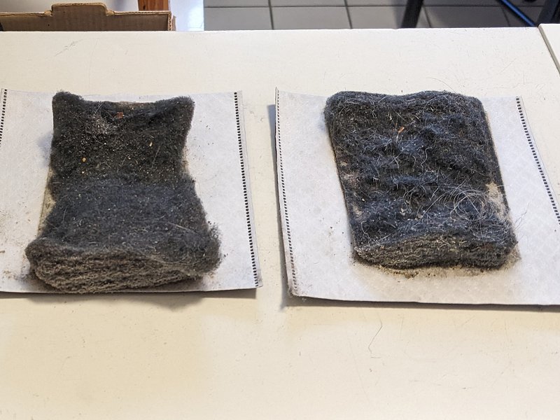 A propos Staub: Neulich (2024) hatte ich Besuch von einem Vorwerk-Vertreter. Ja genau, die, die immer in den Sketchen vorkommen. Ich hatte ihn bestellt, damit er mir mal so einen Wunder-Akku-Staubsauger vorführt. Die beiden oben gezeigten Staubbatzen stammen von zwei kurzen Probesaugungen in meiner Wohnung von jeweils nur ca. 1 m². Krass, was da alles in den Teppichen drinsteckt, das mein 30 Jahre alter röhrender Siemens-Saugstauber nicht rausholen konnte...