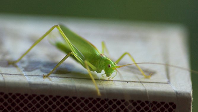 Dieses Männchen der Gemeinen Eichenschrecke (Meconema thalassinum) saß an der Zimmerdecke. Nachdem ich es mit der bewährten Insekten-Rettungs-Streichholzschachtel nach draußen gebracht hatte, wollte es von dort zuerst gar nicht mehr runter...