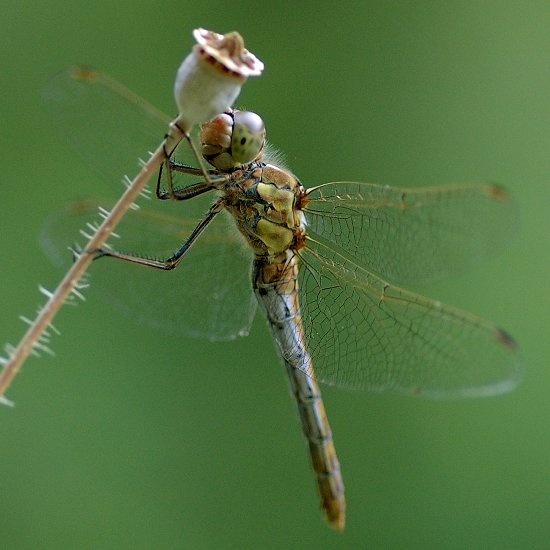 Ein Weibchen der Großen Heidelibelle (Sympetrum striolatum) ruht sich auf einer Mohnkapsel aus.
