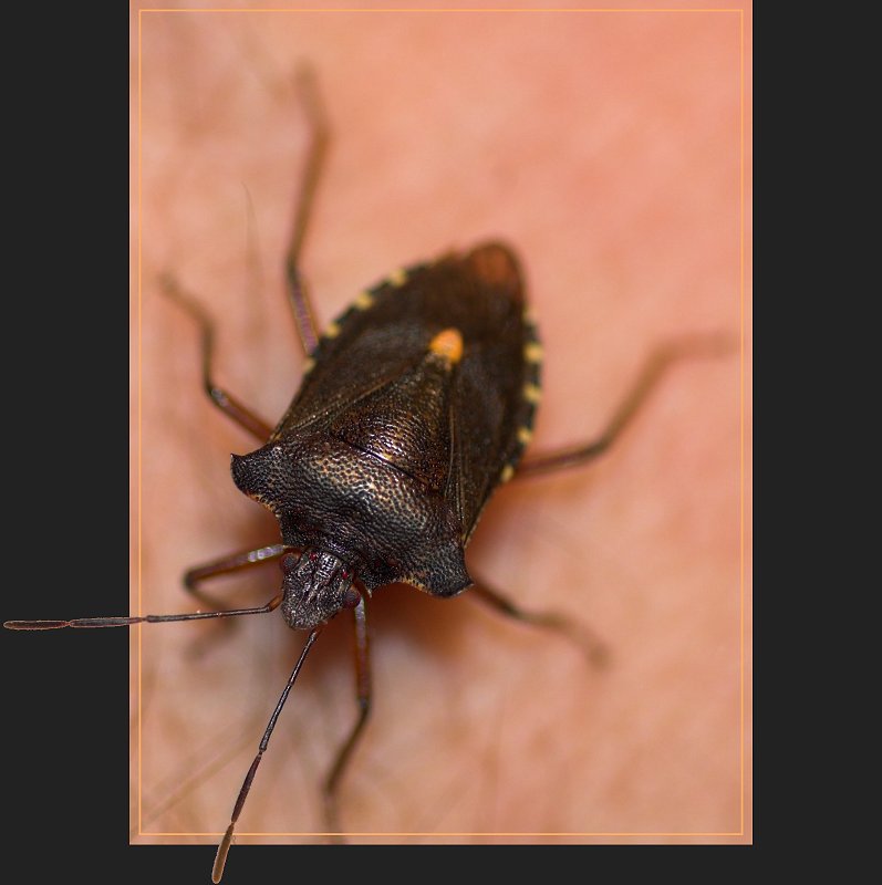 Diese Rotbeinige Baumwanze (Pentatoma rufipes) war abends brummend durch meine Wohnung geflogen und auf meinem Schreibtisch gelandet. Von dort kletterte sie auf meine Hand, so daß ich sie ablichten und dann wieder nach draußen bringen konnte.
