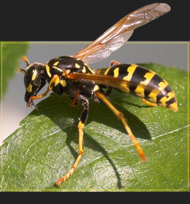 Und hier eine Feldwespe (Polistes dominulus), die das Grünzeug auf meinem Balkon (hier den Kirschbaum) genau unter die Lupe nahm.