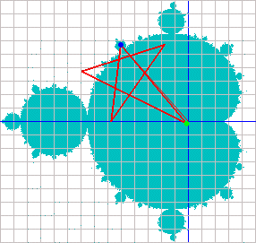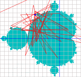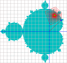Wie man aber bei der Veranschaulichung der Mandelbrot-Iteration Z→Z²+C sehr schön erkennt, tut sich eine ganze Menge, bis feststeht, ob die komplexe Zahl Z zur Mandelbrot-Menge gehört oder nicht: Die Zahl Z "hüpft" während der Iteration auf der Gaußschen Zahlenebene wie wild umher – das müsste sich doch irgendwie zur Einfärbung nutzen lassen...