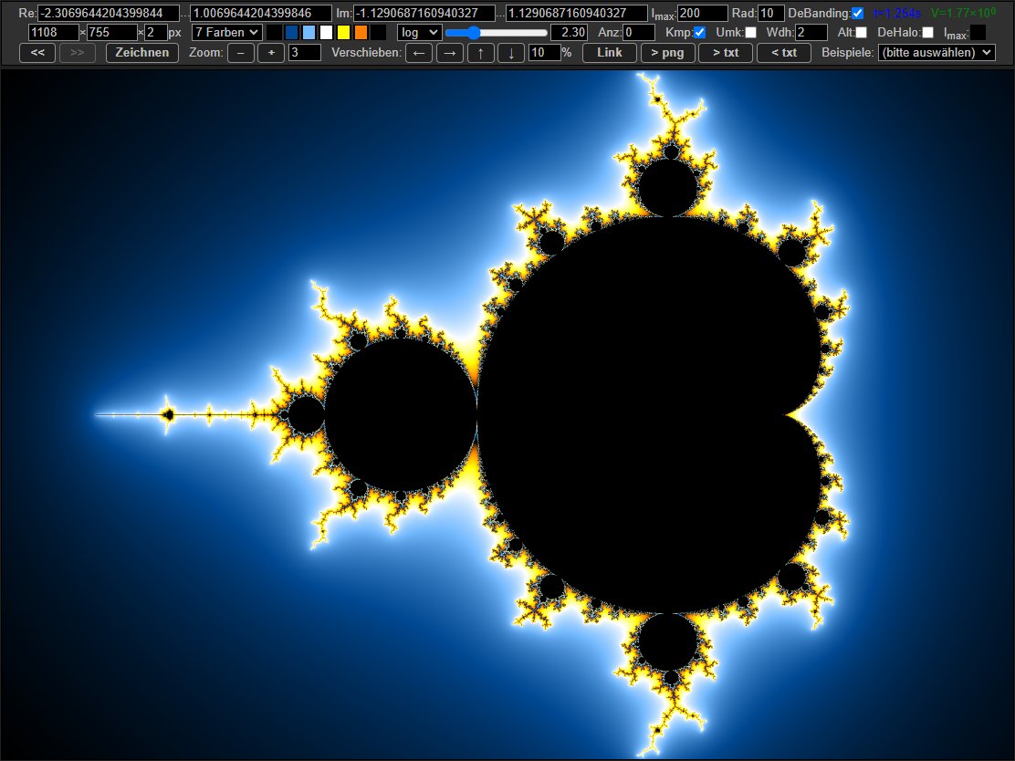Anfangs hatte ich Zweifel, ob JavaScript dafür überhaupt schnell genug ist, aber ich war erstaunt, als das »Apfelmännchen« quasi "instantan" im Browser-Fenster erschien! Was damals auf dem C64 noch Stunden gedauert hat, geht selbst im Browser heute in Millisekunden (gut, bei sehr tiefen Zooms mit fünfstelligen Iterationszahlen und Kantenglättung durch Pixel-Interpolation etc. kann es dann auch schonmal einige Minuten dauern).