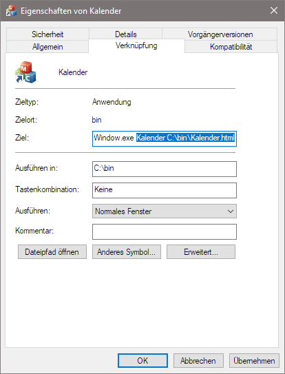 The program shortcuts must be edited afterwards. To do this, open the properties window of the shortcut via right-click > menu item "Properties" and enter the window name (here: Calendar) and the web address (here: C:\bin\Kalender.html) after the program name (here: C:\bin\HtmlWindow.exe) in the "Target" input field: