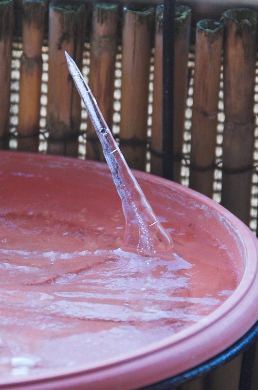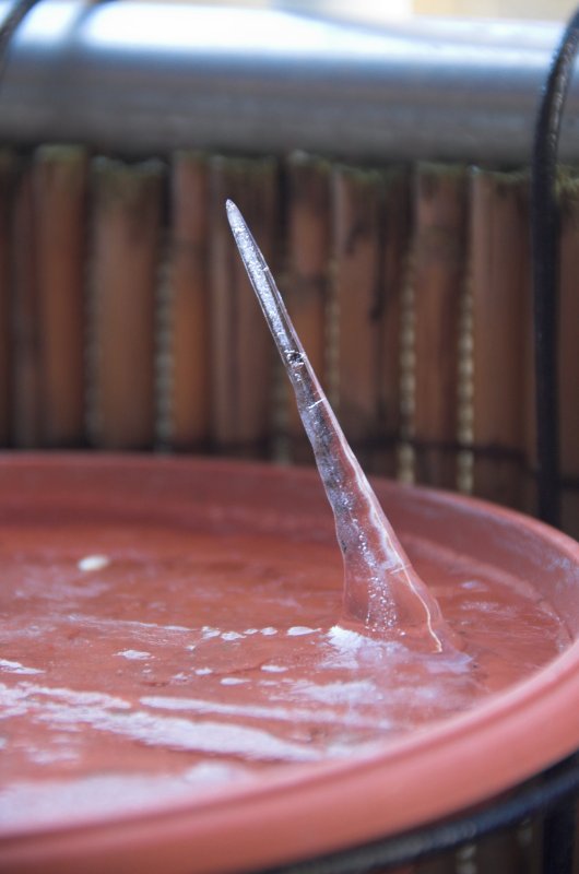 Eines Samstagvormittags entdeckte ich in einem als Vogeltränke dienenden Pflanzen-Untersetzer auf meinem Balkon einen seltsamen, etwas mehr als 70 mm langen Eiszapfen, der schräg nach oben aus dem Wasser herauszuwachsen schien: