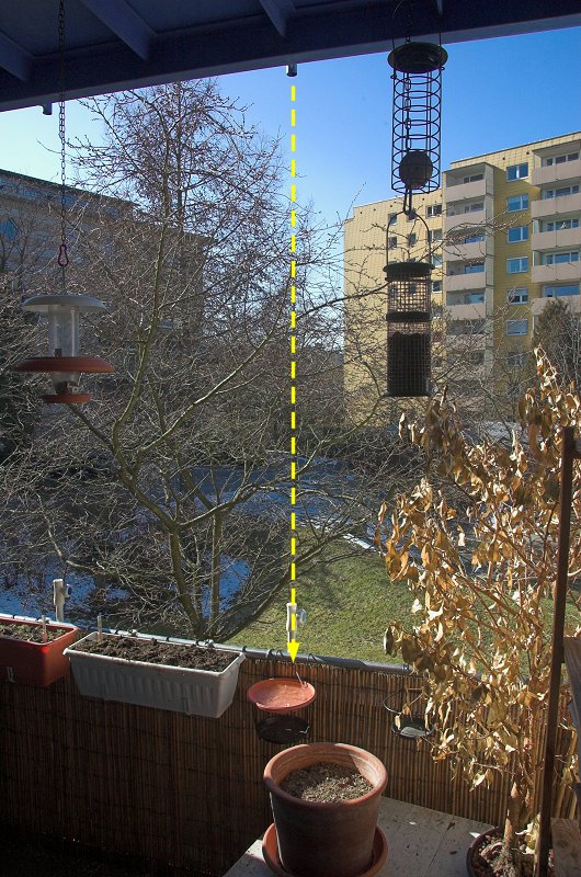 Welches physikalische Phänomen könnte wohl dahinter stecken, fragte ich mich... In der Nacht hatte es gefroren, und zum Zeitpunkt der Aufnahme lag die Temperatur einige Grad über 0 - mit steigender Tendenz. Zuerst überlegte ich, ob vielleicht von oben aus dem Stutzen des Geländers des Balkons über mir Schmelzwasser in die Schale darunter getropft sein könnte, wodurch sich allmählich dieser "Stalagmit" aufgebaut haben könnte.