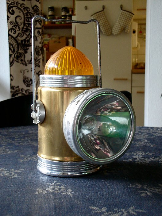 Natürlich googelte ich gleich nach den Angaben, die auf der Lampe zu lesen waren. Ich hatte es zuerst für eine altmodische Form dieser Baustellenlampen gehalten, die Verkehrsteilnehmern bei Dunkelheit durch oranges bzw. gelbes Blinken eine Absperrung signalisieren sollten. Im Internet wird diese Lampe jedoch als "Camping- und Warnlampe" bezeichnet: