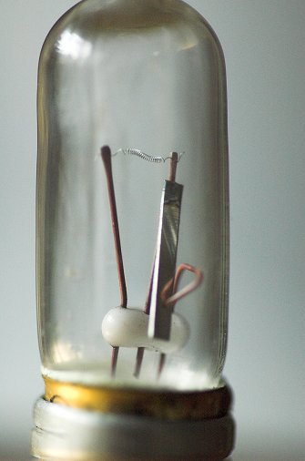 Interessantes Detail: Die obere Blinklampe funktioniert mit einem kleinen Bimetallstreifen innerhalb des 2 cm hohen Glaskolbens, der die Stromzufuhr bei Erwärmung unterbricht, dann abkühlt und den Stromkreis wieder schließt: