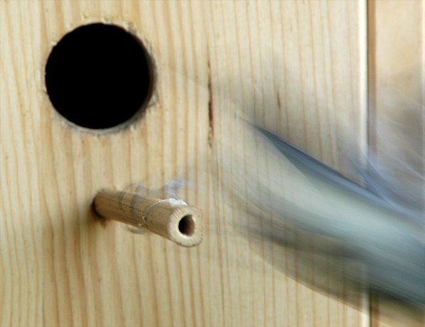 Die Brennweite betrug 120 mm, was 180 mm bei Kleinbild entspricht (mehr schafft das Zoomobjektiv nicht). Fokussiert wurde manuell auf die Mitte der Sitzstange. Trotz der Blende von 8 ist jedoch die Schärfentiefe leider noch nicht ausreichend, um sowohl von der Vorderwand des Nistkastens bis zum Ende der Stange scharf abzubilden. Eine noch kleinere Blende hätte allerdings wieder Bewegungsunschärfe bedeutet; wie sich die auswirkt, ist im folgenden Bild zu sehen: ;-)