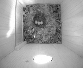 Das dritte wurde wahrscheinlich gestern früh gelegt, wenn ich das Verhalten der Meise richtig gedeutet habe. Sehen konnte man nicht wirklich viel, nur daß sie nach dem Aufwachen zuerst lange still im Nest saß, dann einmal aufstand und kurz "innehielt" und danach im Nest rumwühlte, um die Eier zuzudecken. Heute früh wurde anscheinend nicht "nachgelegt".