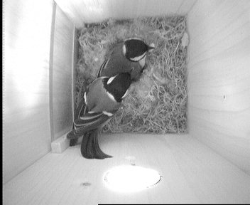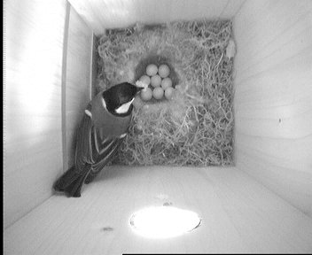 Auch heute war der "Catering-Service" wieder fleißig - und aufmerksam: Das Männchen beobachtet genau, ob das verabreichte Futter auch angenommen wird - ein Verhalten, das auch beim Füttern der Jungen zu beobachten ist: Nachdem die Eltern einem der Jungen das Futter übergeben haben, warten sie immer so lange, bis es auch tatsächlich heruntergeschluckt wurde. Schafft eins der Küken die Portion nicht, wird sie einem anderen gegeben. In dem folgenden Clip vergewissert sich das Männchen, daß das Weibchen die mitgebrachte Portion annimmt (dieses war mittlerweile scheinbar "pupsatt", denn kurz nachdem das Männchen den Kasten verlassen hatte, flog auch das Weibchen mitsamt dem Futter nach draußen).