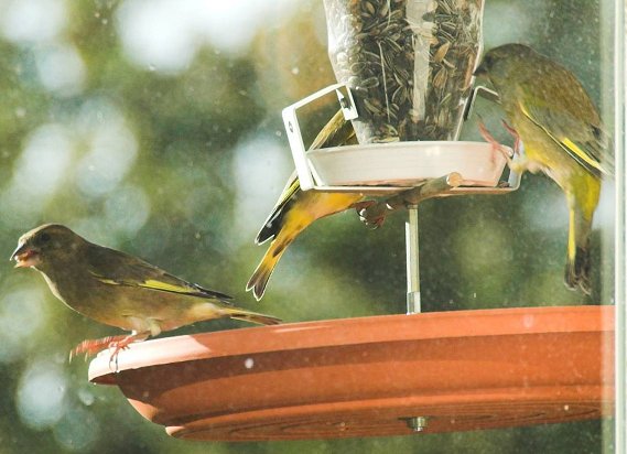 Es wird wieder kälter - letzte Nacht z.B. 6,6 °C - und ich habe den Piepern mal etwas Futter rausgestellt. Während im letzten Winter so gut wie keine Grünfinken zum Fressen gekommen waren, ist es diesmal eine richtige "Invasion" von manchmal 5-6 Finken, die sich um den besten Futterplatz streiten.