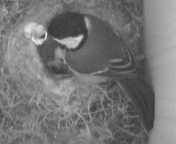Beide Elternvögel beteiligen sich an der Fütterung der Küken, allerdings schienen sich die Kleinen anfangs nicht gerade um das herangebrachte Fressen reißen. Die Eltern mußten sie immer wieder durch Anstubsen und Rufen zum Aufsperren ihrer Schnäbel animieren. Inzwischen sind die beiden aber schon etwas lebhafter geworden.