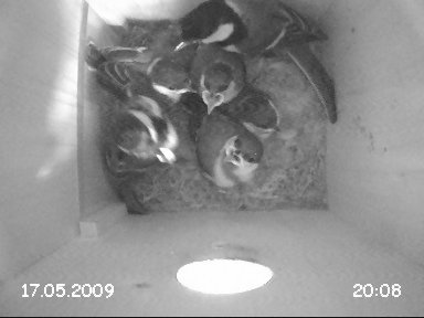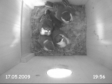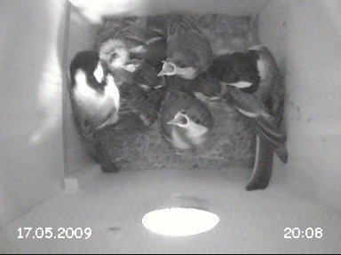 Hier nun ein paar Bilder und Clips. Eigentlich hatte ich vorgehabt, mehrere Videoclips - auch Außenaufnahmen - zusammenzuschneiden, doch leider ist mir der $©µ€¡§ "Windows Video Maker" dabei ständig abgesemmelt - daher hier nur 2 unbearbeitete "Rohclips" direkt aus der Nistkasten-Kamera: