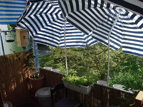 Interessanterweise schienen sich die Meisen an den Sonnenschirmen gar nicht zu stören - sie kamen trotzdem schnurstracks zum Nistkasten geflogen - um dann allerdings beim Anblick des großen Tieres im Liegestuhl sofort wieder die Flucht zu ergreifen. :)