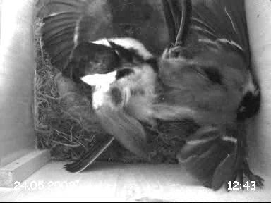 Das Objektiv der Kamera habe ich übrigens mal gegen das weniger weitwinklige der defekten Farbkamera ausgetauscht, so daß jetzt mehr Details vom Nest zu sehen sein sollten. Dafür ist allerdings auch der Ausschnitt kleiner.
