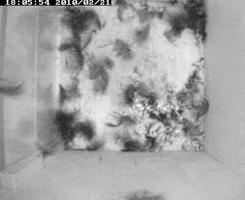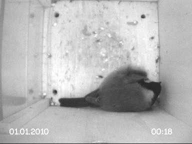 Heute blieb der Nistkasten zum ersten Mal seit 4 Monaten nachts leer. Grund dafür wird wohl ein Revierkampf gewesen sein, der tagsüber stattgefunden haben muß, wovon die ausgerupften Daunenfedern im Nistkasten zeugen: