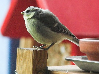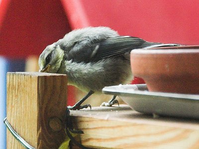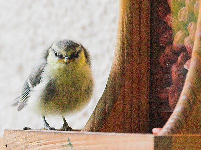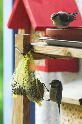 Die Temperaturen sind inzwischen wieder im Keller (10° und ständig Regen) und auf dem Balkon herrscht entsprechend hoher "Flugverkehr": Neben Blau- und Kohlmeisenfamilien mit ihren Jungen kommen derzeit auch gehäuft Buchfinken zum futtern. Zusätzlich zu den Erdnußkernen und dem Fettfutter habe ich jetzt auch wieder Sonnenblumenkerne in den selbstgebauten Futterspender gefüllt - diesmal allerdings geschälte (die aus dem Supermarkt), und die mögen sogar die Meisen (außerdem macht das nicht soviel Dreck auf dem Balkon wie die ungeschälten, deren Schalen sich auf dem gesamten Balkon verteilen.