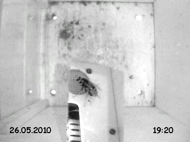 Vielleicht liegt das ja nicht am Wetter, sondern an einer Hornissenkönigin, die sich offenbar ebenfalls für den Nistkasten intressiert. Ganz sicher bin ich mir nicht - es handelt sich um einen ca. 3 cm langen "Brummer", der seit 6 Tagen immer wieder den Nistkasten für mehrere Minuten aufsucht. Man hört dann über das Nistkasten-Mikrofon ein "Kratzen". Zu sehen ist über die Kamera nichts, nur manchmal die Hornisse (?), wenn sie ein- und ausfliegt. Ein Foto davon ist mir bisher noch nicht gelungen, aber mit einem Stück Spiegel, das ich durch das Einflugloch hielt, war das Tierchen über die Nistkasten-Kamera zu sehen: