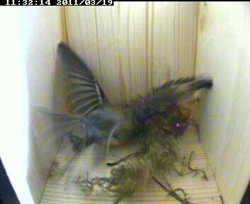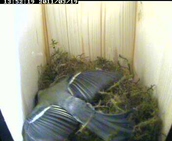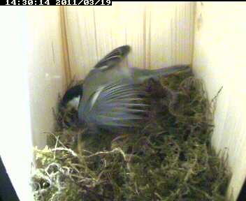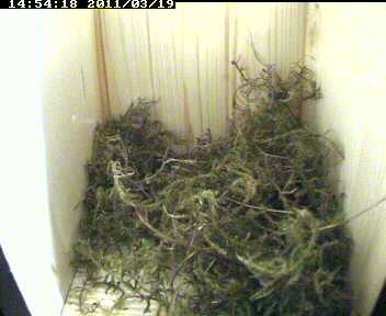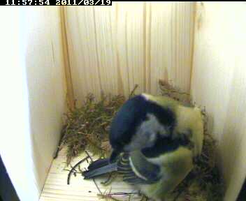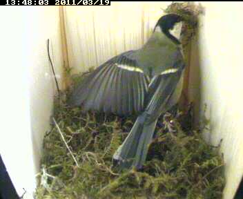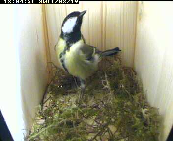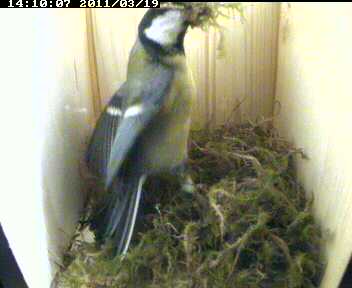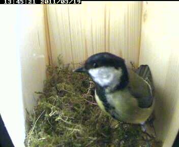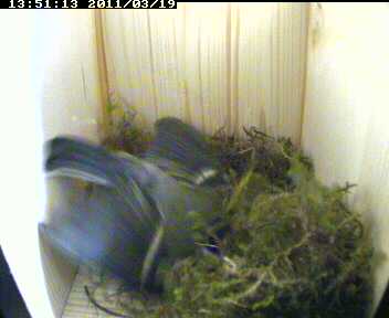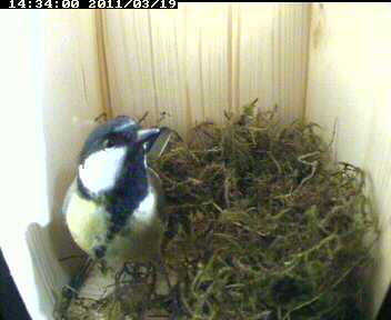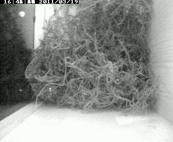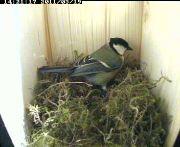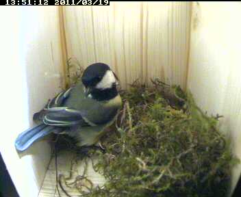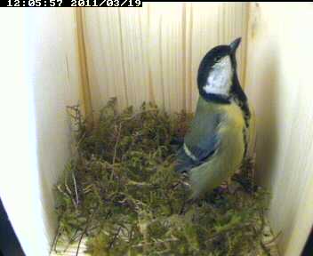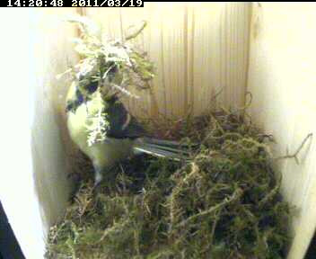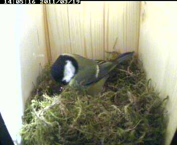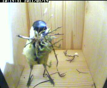 Ich muß schon sagen, daß Madame Meise heute ziemlich fleißig war. Normalerweise dauert der Bau des 1. Nestes im Jahr immer ziemlich lange (von 11 bis 26 Tagen nach meinen Beobachtungen der letzten 6 Jahre), während das 2. Nest viel schneller fertig ist (in 2 bis 6 Tagen). Wenn die Kohlmeisin so weitermacht, kann sie schon nächstes Wochenende mit dem Eierlegen beginnen! :-D