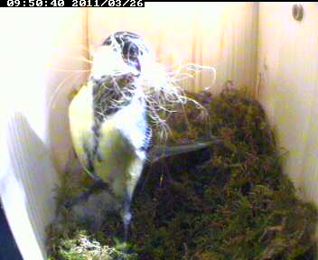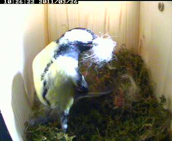 Seit gestern trägt das Meisenweibchen neben Moos nun auch haariges Polstermaterial ins fast fertige Nest - offenbar gedenkt sie in Bälde mit der Eiablage zu beginnen.