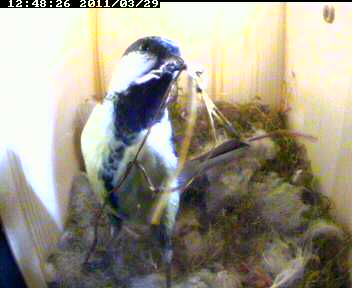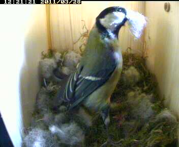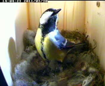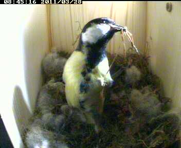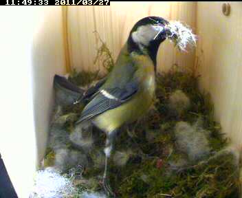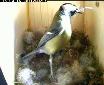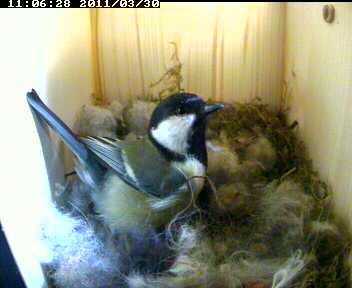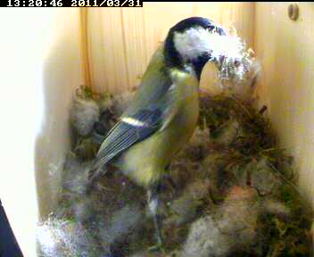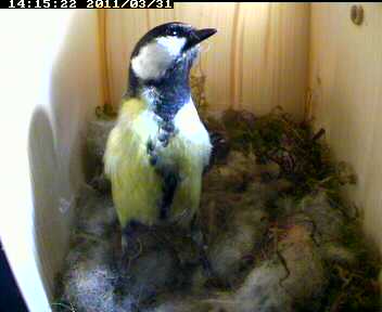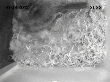 Heute übernachtet Frau Meise das erste Mal seit Beginn des Nestbaus im Nistkasten. Das haben die Meisen bisher nur dann getan, wenn bereits das erste Ei im Nest lag, das nachts warmgehalten werden mußte...