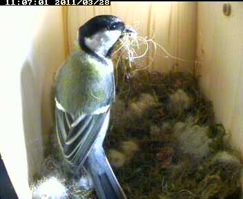Die ganze Woche über wurde weiter am Nest gebaut. Das Nest ist an der rechten Seite ca. 10 cm hoch geworden, wie ich gestern abend beim Öffnen des Nistkastens (zwecks Glasscheibe-Putzen) nachmessen konnte.
